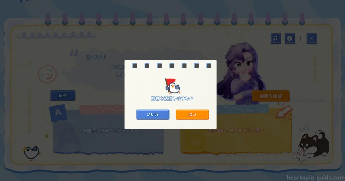 全16問終了すると、「回答を送信しますか?」と表示されるので「はい」を選ぶと、診断結果が表示されます。
