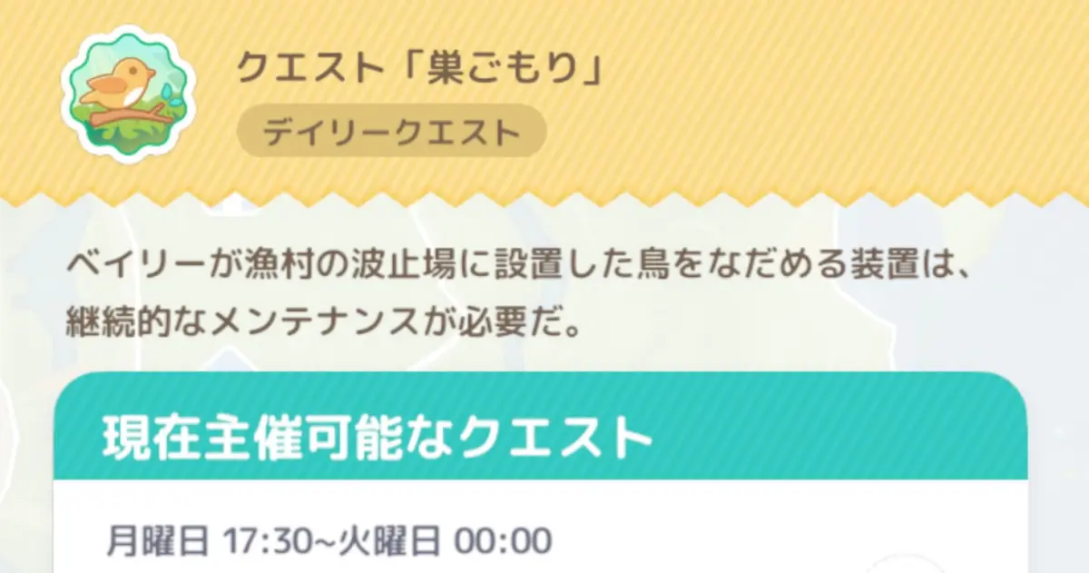 • 巣ごもりクエスト:野鳥観察解放後、ベイリーから電話 → ベイリーに報告で完了