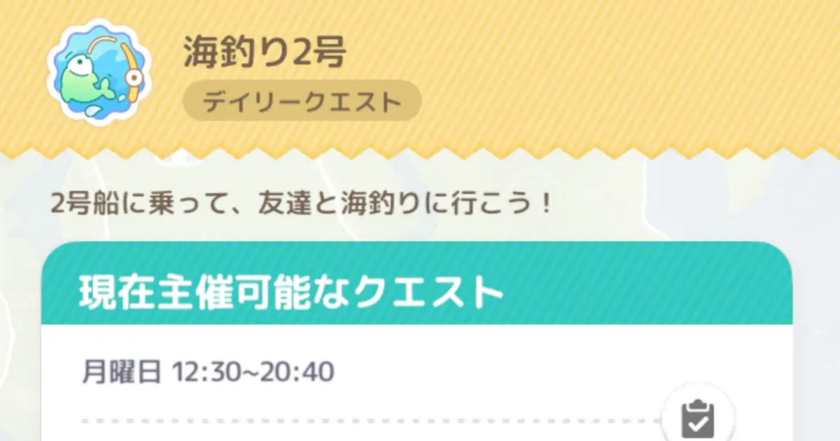 • 海釣りクエスト:開拓者レベル6メインストーリークリア後、ビルから電話 → ビルを訪ねて海釣りに参加 → ビルに報告で完了