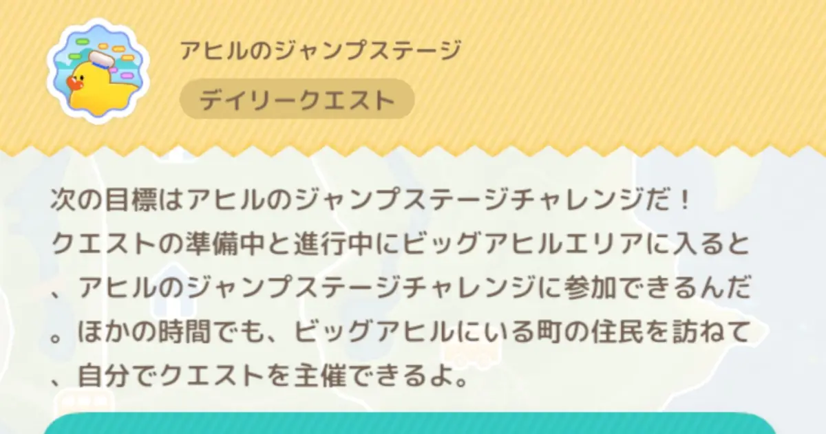 シャボン玉マシンチャレンジやアヒルのジャンプステージは解放条件なしでそのまま参加できます。一方、巣ごもりクエストや虫コイコイは対応する趣味の解放とサブストーリーのクリアが必要です。