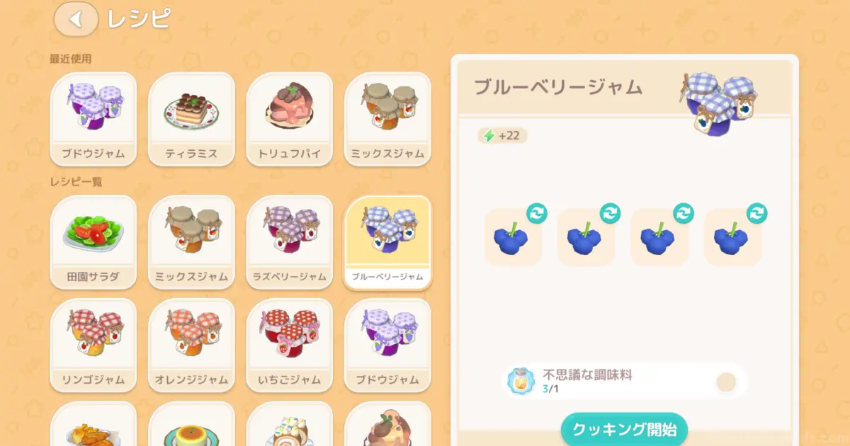 趣味Lv.7で解放されるブドウジャムが、利益・手間のバランスでは最高の金策レシピです。材料の「ぶどう」は栽培するため収穫までに時間はかかりますが、自分で育てれば実質タダ。コスパ・タイパともに他のレシピを上回ります。